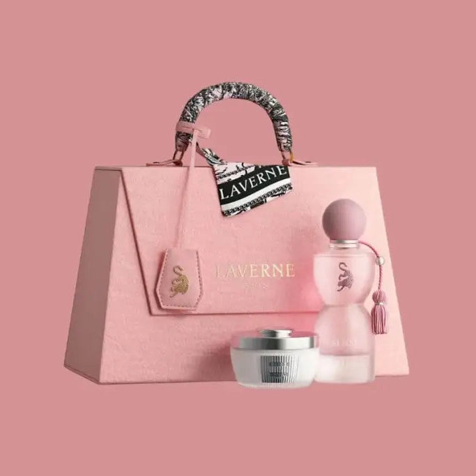 El perfume viene acompañado de unos polvos y el icónico estuche de bolso rosa con pañuelo en el asa